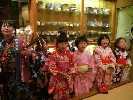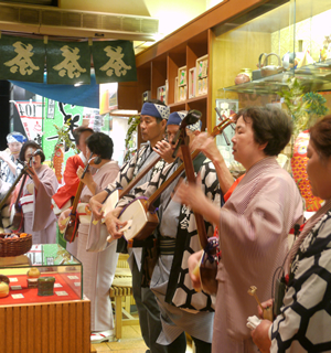 年賀のお祝い廻りをルーツとしている上川端商店街どんたく隊 「博多川端 好いとったい」は、店々を伺っては唄と三味線でお祝いし、全員の「祝~うたぁ~」の声でお開きとなります。