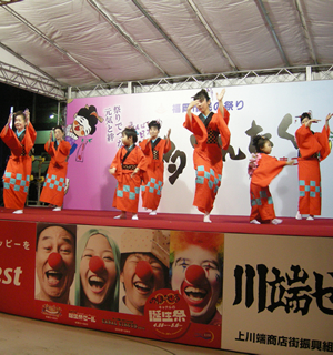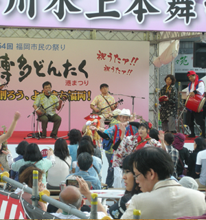 5月3日・4日に行われる「博多どんたく港まつり」の演舞台を、上川端商店街内の川端ぜんざい広場(福岡市博多区上川端町)から対岸の中洲地区までの「博多川上」に設けます。平成13年(2001年)に初めて実施されたこの水上舞台は「博多川水上本舞台」と名付けられ、福岡市内34カ所に設けられる演舞台の中でも「5つの本舞台の一つ」とされており、観光客、地域住民に人気を博しています。